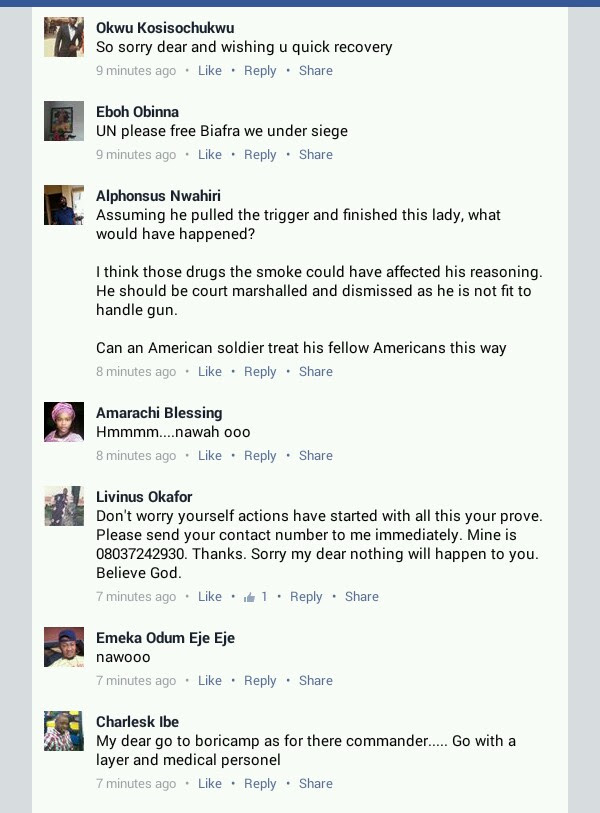 I was helpless as my fellow passengers were scared to intervene, the others (soldiers) disengaged him from hitting me further but they did not reprimand/reprove him. Instead, they confiscated my phone and prevented me from taking pictures of any of them my phone's screen is in pieces now . When i told them that i would nolonger proceed with the journey, they restrained me from going back to Portharcourt by compelling the driver to embark on our journey to (Onitsha) with me.
